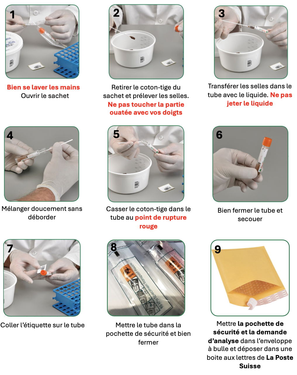 Envoyez l'échantillon dans l'enveloppe à bulle commandée. N'oubliez pas de coller l'étiquette avec le numéro de l'échantillon sur le tube ou la pochette de sécurité.